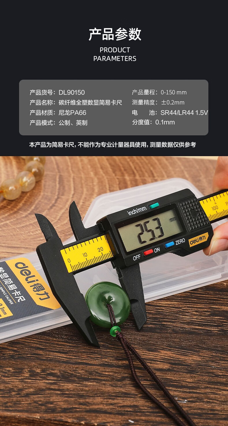商品名稱:得力DL90150 數顯卡尺 碳纖維電子游標卡尺高精度內外徑家用文玩古玩珠寶測量