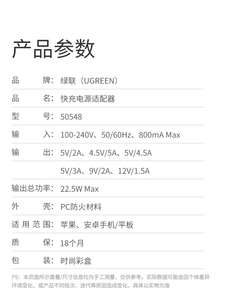 商品名稱:綠聯(lián) 22.5W超級快充頭 適用華為充電器榮耀小米USB數(shù)據(jù)線插頭