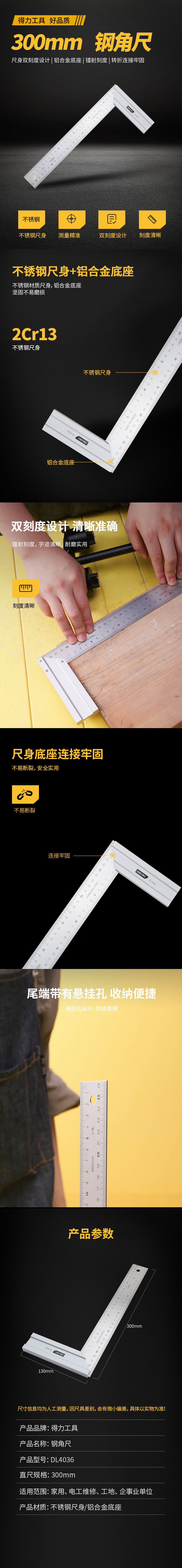 商品名稱:得力DL4036 鋼角尺 不銹鋼直角尺雙刻度角尺測(cè)量方直尺木工尺子300mm