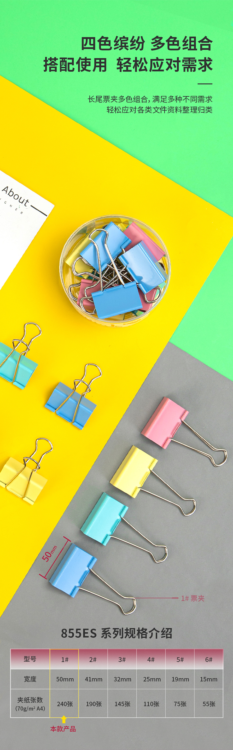 商品名稱:得力8551ES 彩色長尾夾 1#50mm超大號金屬票夾燕尾夾票據(jù)文件夾子 辦公用品 12只/筒