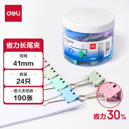商品名稱:得力8552S 省力長尾夾 2#41mm大號(hào)彩色金屬票夾燕尾夾票據(jù)文件夾子 辦公用品 24只/筒