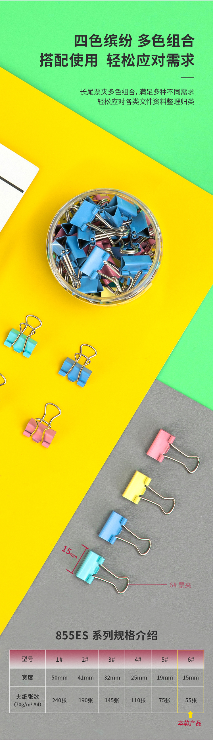 商品名稱:得力8556ES 彩色長尾夾 6#15mm小號(hào)金屬票夾燕尾夾票據(jù)文件夾子 辦公用品 60只/筒